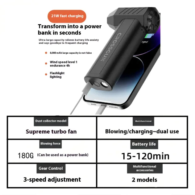 Compact 4-Speed Fan & Vacuum Cleaner, USB Rechargeable